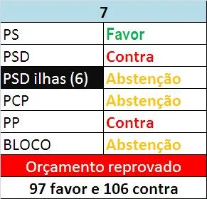 Finalmente neste cenário (7), com os 6 deputados da Madeira e dos Açores do PSD a se absterem, tal como PCP e Bloco - hipótese perfeitamente impensável - e PSD e PP a votarem contra, o OE-2011 continuaria a ser reprovado.