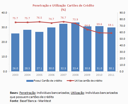 O estudo Basef Banca da Marktest contabiliza 2,2 milhões de portugueses que possuem cartão de crédito, mas os últimos dados sugerem uma quebra na sua utilização. Os resultados de 2011 do estudo Basef Banca contabilizam 2 176 mil possuidores de cartão de crédito, um valor que corresponde a 30.1% do universo composto pelos residentes no Continente com 15 e mais anos que possuem conta bancária. O número dos bancarizados que possuem cartão de crédito tem registado uma tendência geral de crescimento desde 2002, altura em que 25.3% dos indivíduos com conta bancária detinham pelo menos um cartão de crédito. Desde 2008, quando uma taxa de penetração máxima de 33.4% foi observada, este indicador mostra no entanto uma retracção, sendo o valor agora apresentado o mais baixo dos últimos cinco anos. Embora a maioria dos possuidores de cartão de crédito afirme utilizá-lo (59.1% em 2011), os dados evolutivos mostram uma tendência inversa à da penetração. Aliás, estes dois indicadores (posse e utilização) revelam uma correlação de sentido negativo. Ou seja, se nos primeiros anos em análise o número de possuidores de cartão de crédito era menor mas os que o possuíam utilizavam em maior número, essa relação inverte-se nos últimos anos, quando se dá um aumento no número de possuidores e uma relativa estabilização dos que o utilizam de facto. A partir de 2008 é evidente uma quebra no número de indivíduos que diz utilizar o cartão, mais significativa ainda do que a daqueles que refere possuir este meio de pagamento.