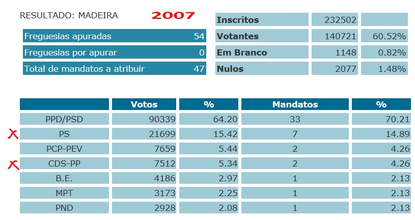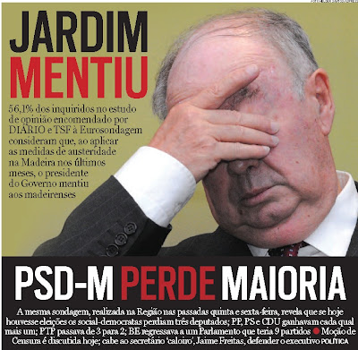 A mesma sondagem, realizada na Região nas passadas quinta e sexta-feira, revela que se as eleições fossem hoje os social-democratas perdiam três deputados, o suficiente para deixarem de ter maioria parlamentar, actualmente presa por valor idêntico. CDS-PP, PS e CDU ganhavam mais um parlamentar, enquanto PND, PAN e MPT não sofreriam qualquer alteração, graças a terem registado melhorias mínimas, mas suficientes para manter representação parlamentar.Em queda está o PTP que perderia um dos três deputados. Quem fica a ganhar nesta sondagem é o Bloco de Esquerda, que regressava ao parlamento madeirense, que assim atingiria novo máximo histórico ao albergar nove partidos. O estudo hoje apresentado permite ainda concluir que PSD, CDS, PS, PTP e PAN têm melhores resultados junto do eleitorado do sexo feminino. CDU, PND, MPT e BE têm mais preferências junto do eleitorado masculino" (texto do jornalista Ricardo Oliveira do DN do Funchal com a devia vénia)