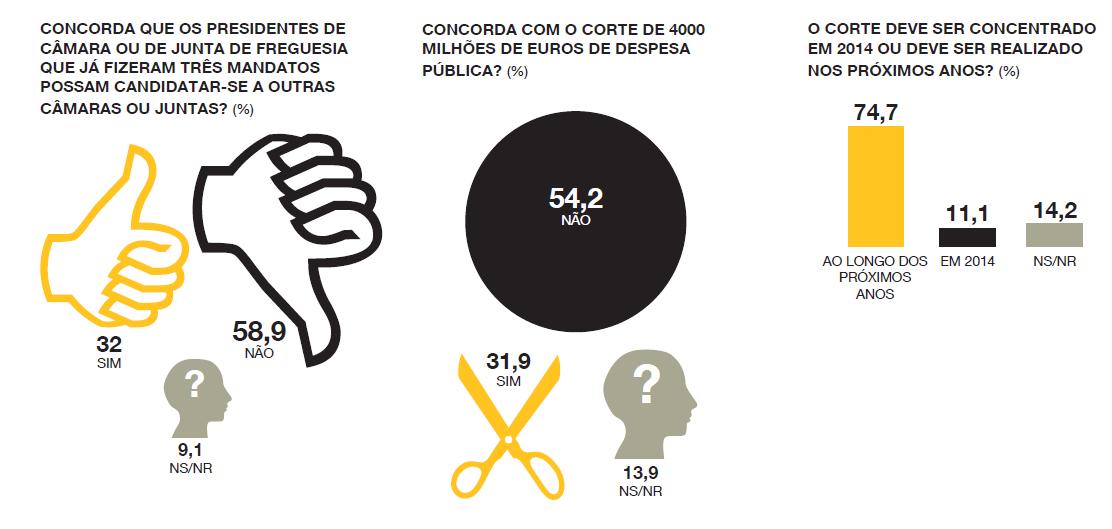 Segundo o Jornal I, "são mais os inquiridos que rejeitam candidatos com três mandatos em outra câmara do que corte de 4 mil milhões. A maioria dos inquiridos pelo barómetro i/Pitagórica está contra a candidatura de autarcas com mais de três mandatos a outra câmara municipal. Ao contrário do que tem sido a interpretação corrente da lei – que permitiu o anúncio das candidaturas de Fernando Seara em Lisboa e Luís Filipe Menezes no Porto – quase 60% dos inquiridos pensam que estas candidaturas não devem avançar. E 32% defendem que os autarcas “dinossauros” podem ser candidatos a outras câmaras, mesmo que tenham já cumprido três ou mais mandatos. Em relação ao corte de quatro mil milhões de euros nas funções do Estado, que o governo está a negociar com a troika, a maioria dos portugueses, 54,2%, defende que não deveriam ser concretizado. Apesar da dureza dos cortes, 31,9% dos inquiridos defendem que devem mesmo ser concretizados. Os números são diferentes quando se fala do melhor momento para realizar estes cortes: 74,7% dos inquiridos consideram que não devem ser concentrados no ano de 2014, ao contrário do que até agora tem sido defendido pelo governo, mas sim ao longo dos próximos anos. Só 11,1% dos inquiridos defende que os cortes sejam todos realizados já no próximo ano.