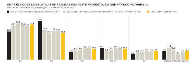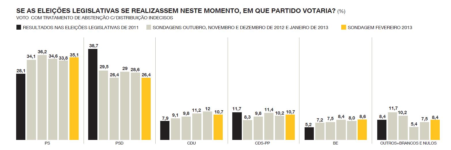 Segundo a jornalista do Jornal I, Ana Sá Lopes, "Paulo Portas está a conseguir com sucesso fazer a travessia governamental entre os pingos da chuva, subindo em relação ao mês passado. O PS de António José Seguro volta a uma fase ascendente, obtendo agora 35,1% das intenções de voto. O barómetro i/Pitagórica de Fevereiro regista mais uma descida do PSD nas intenções de voto. O partido do governo volta agora aos mínimos olímpicos já registados no barómetro de Novembro – em plena discussão e aprovação do Orçamento do Estado. Em Fevereiro, o PSD é contemplado com apenas 26,4% das intenções de voto, quando em Dezembro e Janeiro tinha conseguido aumentar para 29% e 28,6%. Agora volta a recuar, ao contrário do seu parceiro de coligação, o CDS, que sobe nas intenções de voto. O partido de Paulo Portas está agora com 10,7% das intenções de voto, subindo relativamente ao mês de Janeiro, em que obteve 10,2%. O CDS conseguiu recuperar devagarinho dos 8,3% registados em Outubro – o terrível mês da crise na coligação na sequência do desastre da taxa social única. De resto, ano e meio de coabitação governativa não parece estar a causar excessivos danos na intenção de voto do CDS, ao contrário do que acontece no PSD. Nas eleições legislativas de 2011, o CDS obteve 11,7%, agora apenas cai um ponto relativamente aos resultados eleitorais. Por muitos que tenham sido os esforços bem sucedidos de Paulo Portas para fazer o seu partido passar entre os pingos da chuva das responsabilidades governativas em relação à austeridade, a verdade é que nenhum comentador previu a possibilidade de a passagem pelo governo não beliscar as intenções de voto no CDS. O Partido Socialista tem agora 35,1% das intenções de voto, quase 9 pontos à frente do PSD. Está a recuperar, depois de dois meses em que, apesar de nunca perder o lugar de partido mais votado, registou 33,8% e 34,6%. De qualquer forma, encontra-se já a uma distância considerável do resultado obtido por José Sócrates nas legislativas de 2011 – 28,1%. Depois da turbulência que rodeou a sucessão de Francisco Louçã, o Bloco de Esquerda começa agora a recuperar nas sondagens. No barómetro de Fevereiro obtém o melhor resultado desde que se iniciou o barómetro i/Pitagórica – 8,6% das intenções de voto. Nas últimas legislativas, o Bloco de Esquerda conseguiu apenas 5,2% nas urnas. Mesmo assim, a CDU continua a registar um melhor resultado que o Bloco de Esquerda no barómetro i/Pitagórica, embora tenha caído relativamente ao mês de Janeiro. Em Fevereiro, a CDU regista 10,7% das intenções de voto, enquanto no mês passado chegou aos 12% – um salto considerável tendo em conta que nas legislativas o resultado da coligação liderada pelo Partido Comunista se ficou pelos 7,9%. Quanto à coligação “outros”, que agrupa os inquiridos que indicam ir votar em branco ou nulo, registou este mês uma subida relativamente a Janeiro. Está agora nos 8,4%, precisamente a percentagem obtida nas legislativas. Em Dezembro eram apenas 5,4% os inquiridos que se reconheciam neste grupo"