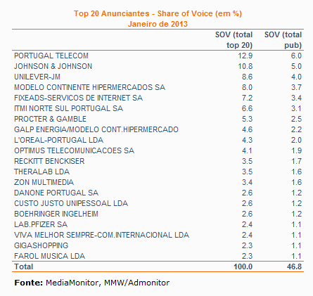 Segundo os dados divulgados pela MediaMonitor, os 20 maiores anunciantes em Janeiro foram responsáveis por quase metade do bolo publicitário, considerando os valores a preços de tabela em Tv, rádio, imprensa, outdoor e cinema. De acordo com os dados da MediaMonitor, os anunciantes portugueses colocaram cerca de 2 milhões de inserções publicitárias nos cinco principais meios above the line (televisão, rádio, imprensa, cinema e outdoor) no mês de Janeiro de 2013. Este valor representou uma descida mensal de 31.6% e homóloga de 22.8%. É de salientar que o período de recolha da informação relativa a Janeiro de 2013 não está ainda concluído para todos os meios, nomeadamente em outdoor, que é o meio com maior peso em número de inserções (ver nota da situação referente ao mês de Janeiro). A Portugal Telecom abre o ano na liderança da tabela dos maiores investidores em publicidade, responsável por um share of voice de 6.0% face ao total do mercado publicitário e de 12.9% relativamente ao total dos 20 maiores anunciantes do mês. A Johnson & Johnson ocupou a segunda posição, responsável por 5.0% do investimento publicitário total e por 10.8% do colocado pelos 20 maiores anunciantes de Janeiro. A Unilever-JM ocupou a terceira posição, com um share of voice de 4.0% face ao total do mercado publicitário e de 8.6% face ao total dos 20 mais. Em conjunto, os 20 maiores anunciantes foram responsáveis por mais quase metade (46.8%) do bolo publicitário mensal , em preços de tabela.