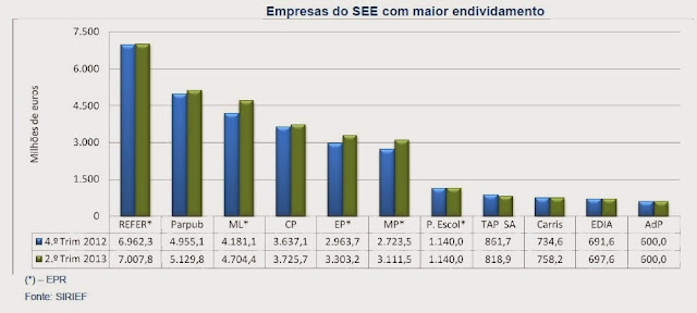 • O SEE registou um aumento do endividamento de 5,9%, face ao 4º trimestre de 2012, ascendendo a 33.850,9 M€, repartidos pelas Empresas Públicas Não Reclassificadas (EPNR), num total de 14.355,6 M€ (+4,3%), e Empresas Públicas Reclassificadas (EPR), num total de 19.495,4 M€ (+7,1%) (fonte: relatório da Direcção-Geral do Tesouro e Finanças)